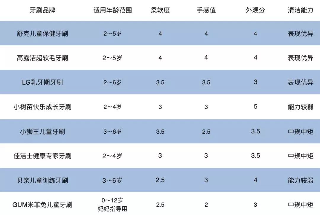 注:柔软度、手感值、外观分评分标准为1-5分,由于儿童对牙刷有自己的审美和感知,数值的大小并不完全说明优劣。