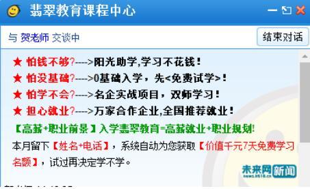其实在职业教育领域,“先就业后付款”“学费不够帮*款贷**”是多家培训机构惯用的宣传招生手段。打开IT职业教育机构北风网、翡翠教育、北大青鸟等官网,不到3秒时间就会有其在线咨询老师的弹窗出现,弹窗中的信息也都大同小异,尽是“包就业”“高起薪”等字眼。